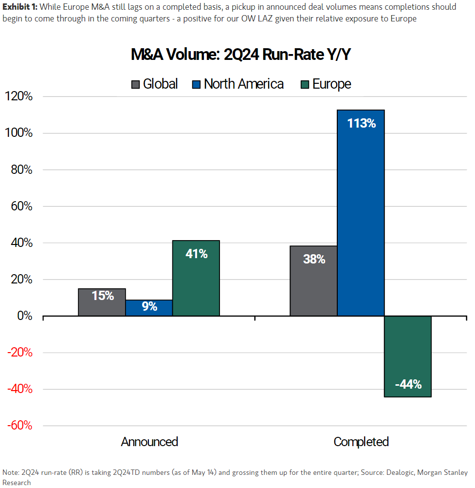 Morgan Stanley | REPUNTE GLOBAL DE M&A => El tracker de M&A de los analistas hasta mediados de mayo respalda su visión optimista respecto al volumen de operaciones completadas … donde esperan una inflexión positiva del 35% y/y …durante el segundo trimestre, con margen para un upside todavía mayor. Si bien el número de acuerdos completados está más sesgado hacia el continente americano, el número de anuncios en Europa está repuntando significativamente: