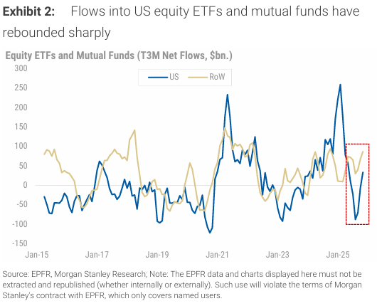 Morgan Stanley | El “Liberation Day” reavivó el debate sobre el fin del “excepcionalismo estadounidense” y la posibilidad de una rotación de activos hacia el RoW. De hecho, la caída de los flujos hacia ETFs y fondos Estados Unidos en torno a abril evidenció ese cambio en el sentimiento inversor. Sin embargo, en los últimos meses, los flujos hacia ETFs y Fondos de renta variable estadounidenses han rebotado con fuerza.