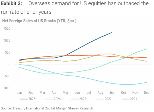 De hecho, si se considera la “demanda extranjera total” de equity Estados Unidos, ésta se encuentra en su nivel más alto de al menos los últimos 5Y. Lo interesante es que, al igual que con los aranceles, el interés por los flujos estadounidenses ha ido disminuyendo, a medida que los inversores han ido asumiendo que el equity Estados Unidos sigue siendo de los más competitivos, no solo en términos de rentabilidad, sino quizás más importante, en términos de tamaño y liquidez.