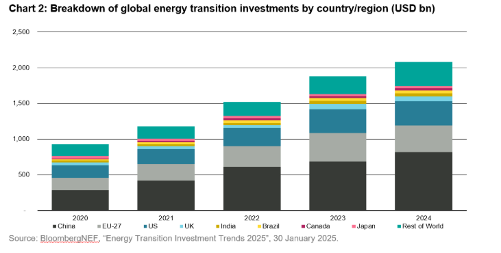Desde una perspectiva regional, la contribución de China a la transición energética ha crecido sustancialmente y ahora es el líder mundial indiscutible. Con un gasto de más de 800.000 millones de dólares, China representó casi el 40% de la inversión total en el ámbito de la transición energética mundial en 2024. El aumento de la inversión de China con respecto al año anterior también representó dos tercios del aumento total del gasto mundial durante 2024. Por el contrario, la contribución de Estados Unidos fue mucho menor, aproximadamente del 16%, aunque cabe señalar que, incluso durante el mandato del presidente Biden (administración proambiental, reincorporación al Acuerdo de París, introducción de la IRA), la contribución de Estados Unidos no superó el 19%.
