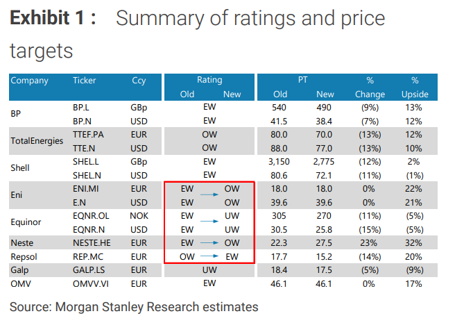 Morgan Stanley | El mercado de petróleo aún está tirante, pero se debilitará tras el 3T a medida que alcance un equilibrio por desaceleración de demanda y aumento de producción. Al mismo tiempo, los precios de TTF y LNG ya no tienen recorrido y para el 2S25 los mercados de gas a nivel global iniciarán un periodo largo de expansión de capacidad. Con este outlook para el petróleo y gas, nuestro analista Martijn Rats ve un riesgo a la baja en las estimaciones de beneficios y FCF del consenso para 2025 del 10% de media. El consenso ya asume que las distribuciones a los accionistas alcanzará un récord como % del FCF operativo. El entorno macro actual de caída en tipos de interés e inflación implica que el sector no será capaz de hacerlo mejor que el mercado. Sube Eni a OW (nuevo top pick), sube Neste a OW, mantiene OW en Total, mantiene EW en BP y Shell, baja Repsol a EW (por debilidad en refino y ausencia de catalizadores), baja Equinor a UW (por su elevada exposición al gas europeo, y reitera UW en Galp.